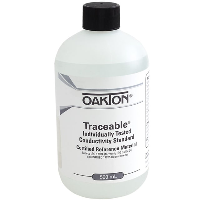 All Oakton Traceable conductivity standards are NIST-traceable reference materials Supplied with a calibration report from an ISO 17034 and ISO 17025 accredited laboratory These standard solutions let you calibrate conductivity instruments to ensure accuracy If unopened, shelf life is one year; once opened, shelf life will vary by solution value. Standards have detailed labels: KCl, NaCl, and 442 conversions, temperature corrections, and certified values referenced to 25C. Average accuracy at 25C is 0.25 microsiemens for 1, 5, 10 microsiemen (S) solutions, or 0.25% for all other solutions. The tested uncertainty is shown on the certificate, whichever is greater.