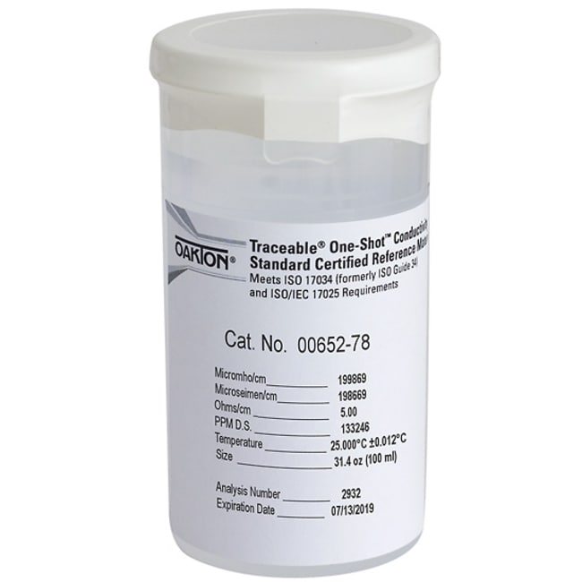All Oakton Traceable conductivity standards are NIST-traceable reference materials Supplied with a calibration report from an ISO 17034 and ISO 17025 accredited laboratory These standard solutions let you calibrate conductivity instruments to ensure accuracy If unopened, shelf life is one year; once opened, shelf life will vary by solution value. Standards have detailed labels: KCl, NaCl, and 442 conversions, temperature corrections, and certified values referenced to 25C. Average accuracy at 25C is 0.25 microsiemens for 1, 5, 10 microsiemen (S) solutions, or 0.25% for all other solutions. The tested uncertainty is shown on the certificate, whichever is greater.