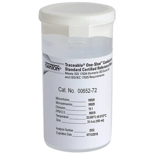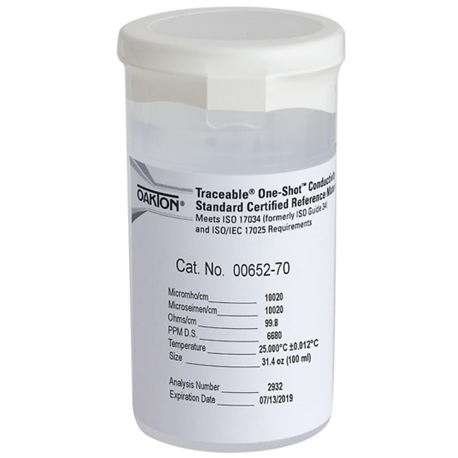 Oakton Traceable One-Shot™ conductivity and TDS standards include detailed KCl, NaCl, and 442 conversions, temperature corrections, and certified values referenced to 25C. Average accuracy at 25C is 0.25 microsiemens for 1, 5, 10 microsiemen (S) solutions, or 0.25% for all other solutions. The tested uncertainty is shown on the certificate, whichever is greater. Conductivity options range from 1 to 200,000 S/cm. Batch-tested solutions are lot certified; a few bottles from a single lot are analyzed