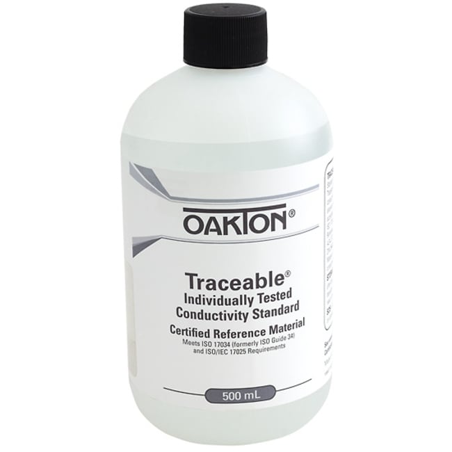 All Oakton Traceable conductivity standards are NIST-traceable reference materials Supplied with a calibration report from an ISO 17034 and ISO 17025 accredited laboratory These standard solutions let you calibrate conductivity instruments to ensure accuracy If unopened, shelf life is one year; once opened, shelf life will vary by solution value. Standards have detailed labels: KCl, NaCl, and 442 conversions, temperature corrections, and certified values referenced to 25C. Average accuracy at 25C is 0.25 microsiemens for 1, 5, 10 microsiemen (S) solutions, or 0.25% for all other solutions. The tested uncertainty is shown on the certificate, whichever is greater.