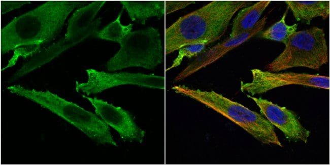 Recommended positive controls: HeLa, 293T, A431, H1299, mouse brain, rat brain, PC-12, Rat2. Predicted reactivity: Mouse (100%), Rat (100%), Pig (100%), Bovine (100%). Store product as a concentrated solution. Centrifuge briefly prior to opening the vial.
