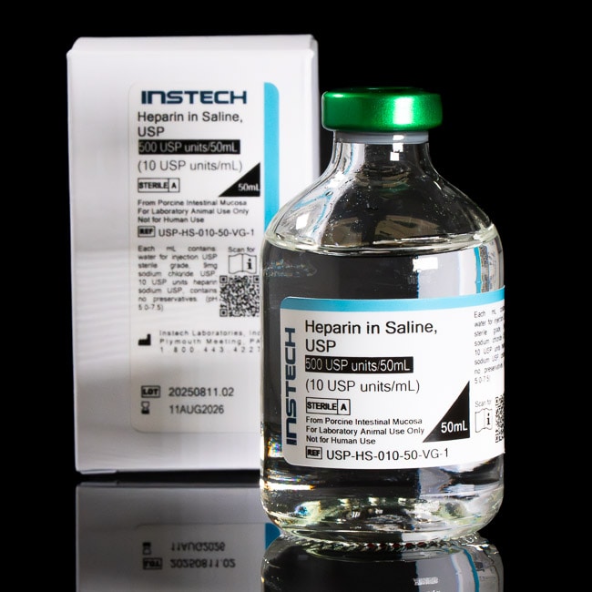 The Instech USP-HS-010-50-VG-1 is a pharmaceutical-grade sterile catheter lock solution specifically formulated for laboratory animal research. Prepared with heparin sodium following USP standards for compounding sterile preparations, this solution helps maintain catheter patency. The vial features a standard cap and is color-coded green to assist in the quick identification of heparin-saline formulations in the lab.