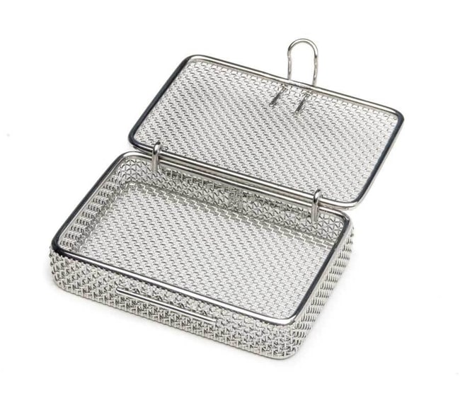 Mesh sterilization baskets are perfect for sterilizing, storing and organizing small components or instrument. These baskets are manufactured from 304 stainlesss steel. They are non-magnetic and electropolished. They are burr-free to protect the instrument wraps from tearing. The fine mesh has open squares of 1.6 mm, and the wire edge diameter is 0.7 mm. These baskets come with a wire locking clip. This style of sterilization baskets is available in three sizes: 4x4x2 cm, 8x8x3.4 cm, and 10.5x7x2.5 cm.