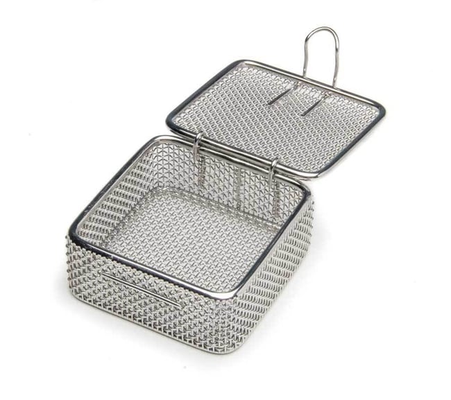 Mesh sterilization baskets are perfect for sterilizing, storing and organizing small components or instrument. These baskets are manufactured from 304 stainlesss steel. They are non-magnetic and electropolished. They are burr-free to protect the instrument wraps from tearing. The fine mesh has open squares of 1.6 mm, and the wire edge diameter is 0.7 mm. These baskets come with a wire locking clip. This style of sterilization baskets is available in three sizes: 4x4x2 cm, 8x8x3.4 cm, and 10.5x7x2.5 cm.
