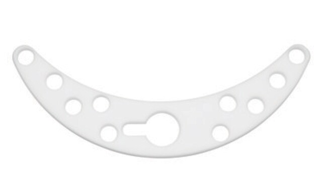 Stirrer Blade, PTFE, Banana Shape, Perforated, 10mm, for 22000mL Flasks, 55/50 minimum joint clearance. Blade is shaped to resemble the contour of a round bottom flask. Blades are perforated. Made of 1/8" PTFE to fit 10mm OD stirrer shafts. Minimum joint size listed is the size required to allow passage of the blade.