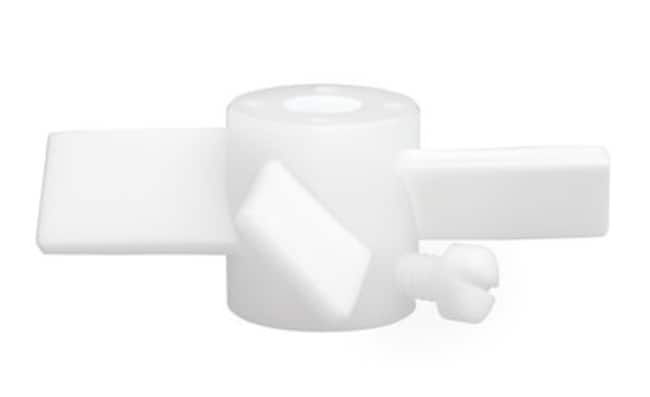 Agitator, PTFE, 10mm, Four Blade, 100mm Dia, Fits Shaft Size 10mm, 45¿ Impeller Angle. Agitators are made entirely of PTFE and glass filled PTFE and are for use with 10mm OD stirrer shaft CG-2075-B. Available in 45¿, 60¿ and 90¿ impeller angles. The 45¿ and 60¿ impellers are set up to stir downwards in a clockwise direction and upwards when rotated counter-clockwise. Agitator hub is open so that it can be positioned anywhere along the stirrer shaft and locks onto shaft with a glass filled TFE screw.