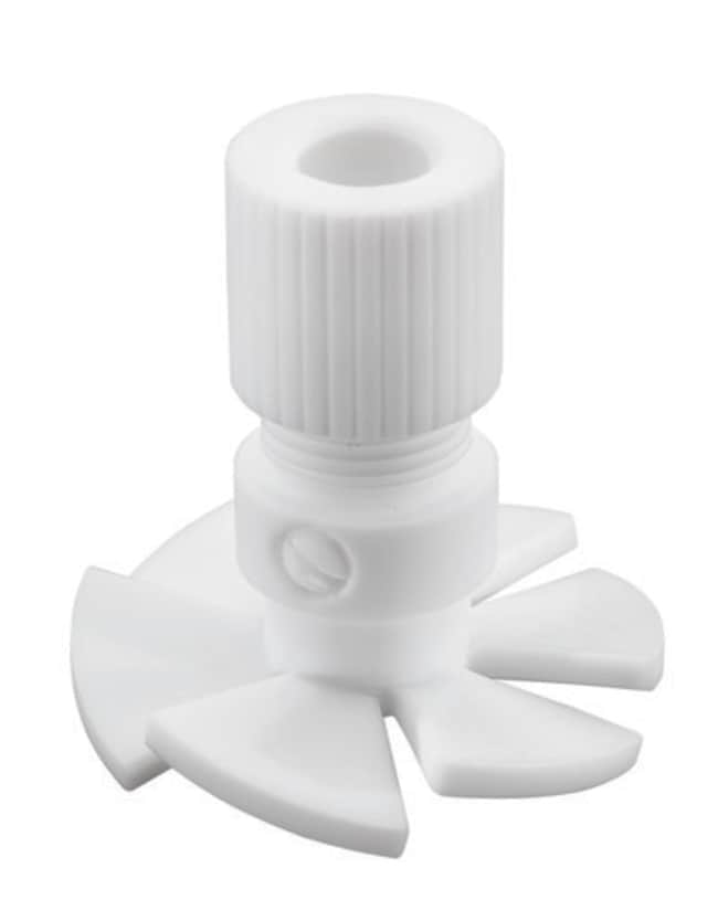 Agitator, Turbine, PTFE, 100mm Dia, Fits Shaft Size 10mm. Agitators are made entirely of PTFE and glass filled PTFE and are for use with 10mm OD stirrer shaft CG-2075-B. Great for use a “foam breaker” at the liquid level in the reactor. Agitator hub is open so that it can be positioned anywhere along the stirrer shaft.