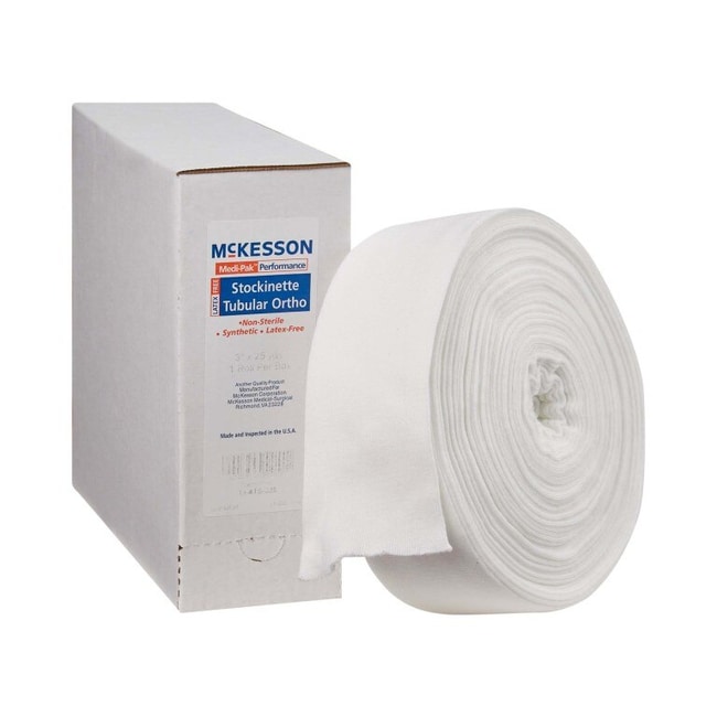 Stockinette Tubular McKesson 3 Inch X 25 Yard Polyester NonSterile Knitted from high-grade yarn and inspected to guarantee consistent knit construction, cleanliness, and proper roll dimensions Designed for use with synthetic casting systems because of wicking action and fast-drying features Packaged in an easy-to-use dispenser box on a continuous roll, allowing user to determine length Polyester White 3 inches x 25 yards