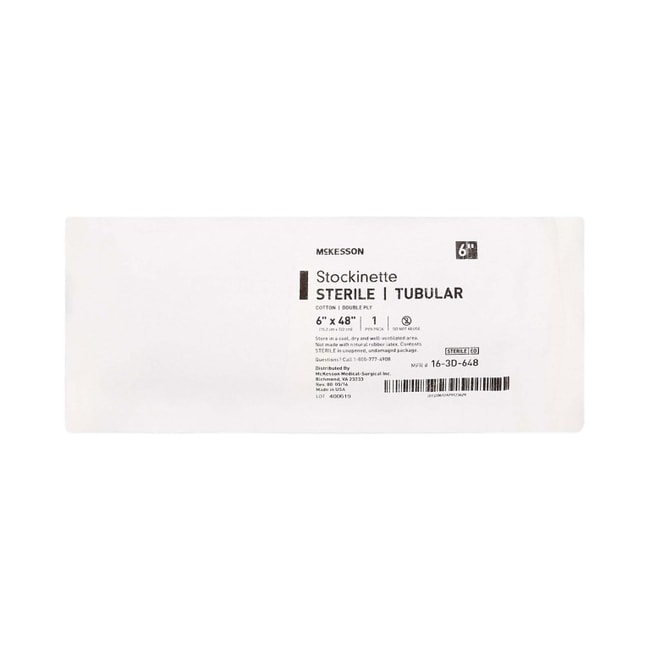 Surgical Stockinette Tubular McKesson 6 X 48 Inch Sterile Knitted from high-grade yarn and inspected to guarantee consistent knit construction, cleanliness, and proper roll dimensions Provides pressure to hold dressing in place Packaged in an easy-to-use dispenser box on a continuous roll, allowing user to determine length Cotton Beige 6 x 48 inches