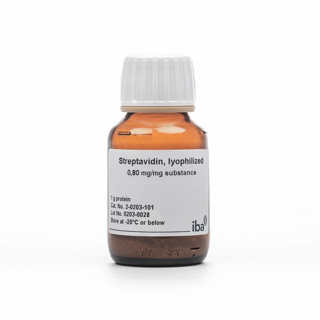Streptavidin is a tetrameric protein composed of identic subunits. Each subunit specifically binds one biotin molecule with fM affinity, which makes it one of the strongest non-covalent interactions known. The preparation contains an N- and C-terminal shortened variant with improved properties regarding homogeneity, solubility, resistance towards proteolytic degradation, and accessibility of the biotin binding pocket as compared to native streptavidin. The streptavidin:biotin system is widely used for immobilization and detection of biotinylated molecules. IBA Lifesciences provides bulk amounts of lyophilized streptavidin in reliable and high quality at competitive prices to generate streptavidin-coated surfaces (microplates, SPR chips, beads) or conjugated detection reagents. Please note that streptavidin is not applicable for detection, immobilization, and purification of Strep-tagII and Twin-Strep-tag fusion proteins, since the binding affinity for both tags is too low.