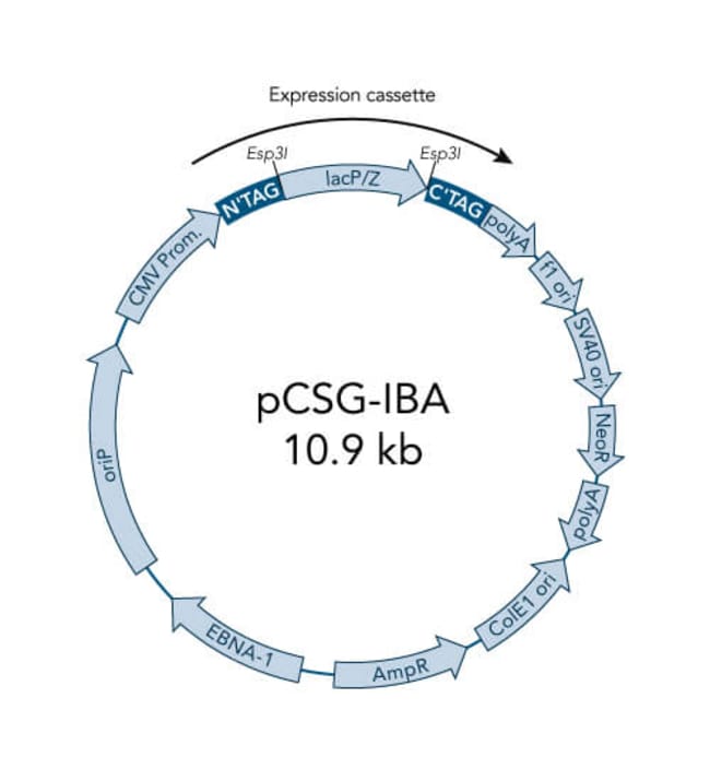 pCSG-IBAwt2 is a large expression vector with universal features for transient expression as well as for generation of stable mammalian cell lines. The vector carries an ampicillin resistance cassette for selection of transformed E. coli cells and ColE1 origin for a high plasmid copy number. Extrachromosomal replication in mammalian cells could occur either by origin of replication from Epstein-Barr Virus (oriP) or by SV40 ori. For the former the vector provides the EBNA-1 gene and for the latter the cell line has to be latently infected with SV40 or express the SV40 large T antigen (e.g. HEK293T, COS-1, COS-7). Stable cell lines can be selected by the neomycin resistance gene (NeoR). In addition, the human cytomegalovirus (CMV) immediate-early promoter enables a high-level expression. During translocation from the cytosol the signal peptide is removed from the protein by endogenous proteases.
