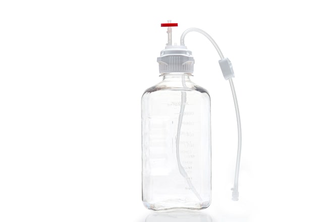 Made To Order MTO Single Use Sterile 2000mL (2L) Polycarbonate Media Bottle Assemblies with Tubing and Vent Filters. EZBio MTO Single Use Media Bottle Assemblies include a 2-port 53B VersaCap assembly with 1/8" ID (3.2mm) x 1/4" OD (6.4mm) Pureweld® TPE Tubing and diptube. This bottle assembly features a hose barb plug that keeps the line closed until it is removed for use. Additionally, all bottle assemblies include a 0.2µm Hydrophobic PTFE Vent Filter that allows for ventilation while preventing media from escaping in the event of a spill. All EZBio "MTO" Single Use Media Bottle Assemblies also include an extra closed cap for storage and a ratchet style pinch clamp that allows the user to control flow into the container or close off the line entirely. The EZBio "MTO" Bottle Assembly is the perfect option to phase out costly stainless steel apparatuses that are expensive to clean and validate. USP Class VI components, Gamma Irradiated in USA.