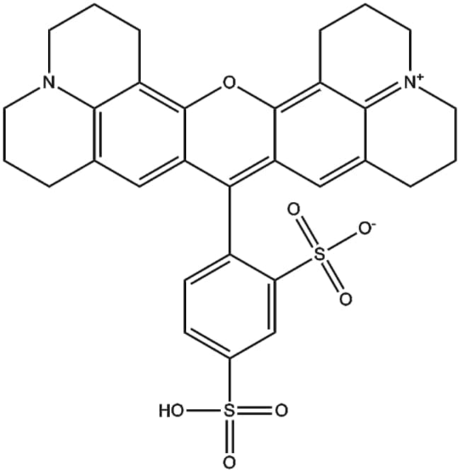 Sulforhodamine 101 (60311-02-6) is a red-emitting fluorescent dye primarily utilized as a selective marker for astrocytes Sulforhodamine 101 selectively accumulates in astrocytes enabling differentiation from surrounding neuronal populations In neurobiological studies using live tissue imaging including acute brain slice preparations the dye facilitates visualization of astroglial cell morphology and cellular dynamics Based on these properties Sulforhodamine 101 holds research potential in the study of astrocyte-specific responses morphological characteristics and cell cell interactions within neuronal tissues