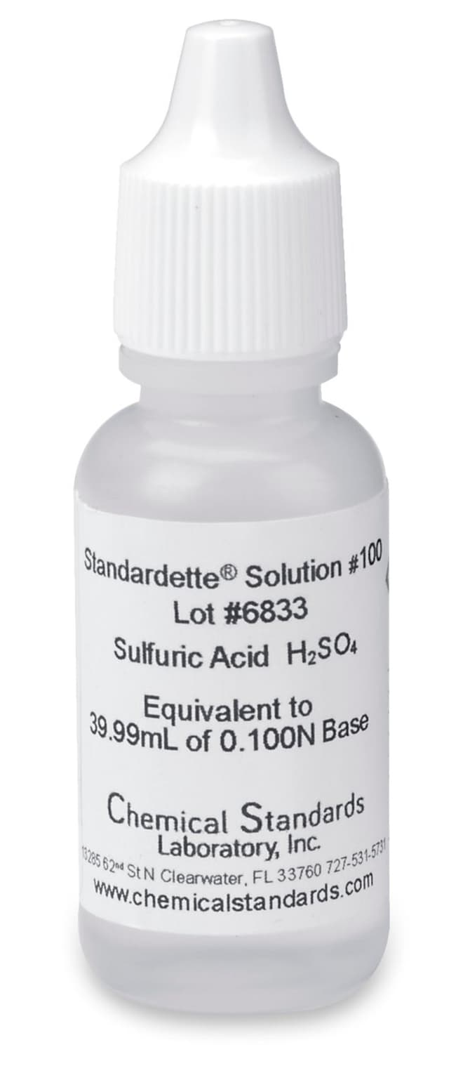 The Sulfuric Acid Standardette Solution #100 was designed to ensure precision, efficiency and standardization of 0.100 N base titrants when performing titrations in your lab. With a unique method of standardizing solutions, these single use bottles will make your process faster, easier and more accurate than traditional methods.