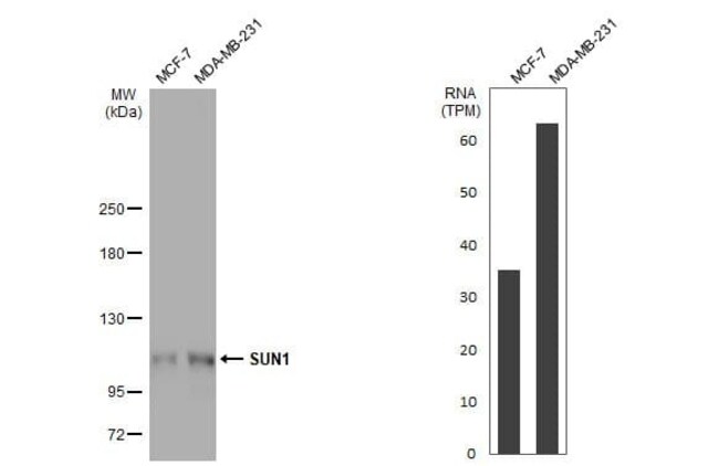 SUN1 Monoclonal antibody specifically detects SUN1 in Human, Mouse samples. It is validated for Western Blot, Immunohistochemistry, Immunocytochemistry/ Immunofluorescence, Immunohistochemistry (Paraffin)Specifications
