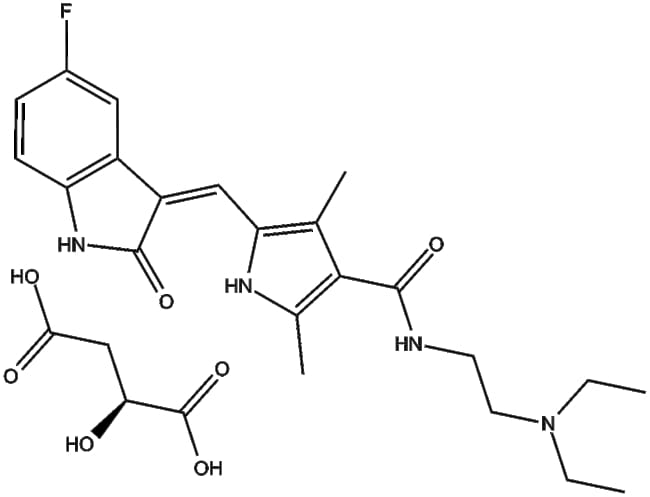 Sunitinib malate (CAS 341031-54-7) is a small molecule orally bioavailable multitargeted receptor tyrosine kinase inhibitor It inhibits various receptor tyrosine kinases including platelet-derived growth factor receptor (PDGFR) vascular endothelial growth factor receptors (VEGFR-1 2 and 3) c-KIT FLT3 kinase colony-stimulating factor-1 receptor (CSF-1R) and RET kinase In neuroblastoma cell lines (e g SK-N-BE(2) SH-SY5Y LAN-5) treatment with sunitinib malate significantly suppresses proliferation in a dose-dependent manner (IC50 10-20 ng/ml) Preclinical studies show tumor growth inhibition and reduced metastasis in neuroblastoma mouse models highlighting its potential for research in oncology therapeutics