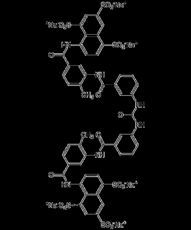 MF: C51H34N6O23S6 . 6Na, MW: 1429.180, ≥98%, Appearance: White to off-white powder. Potent ATPase inhibitor. Potent competitive inhibitor of reverse transcriptase. Shows anti-HIV activity. Anticancer compound. Protein kinase C (PKC) inhibitor.