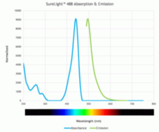 SureLight™ 488 is a bright green fluorescent dye with excitation suited to the 488 nm laser line, fluorescent microscopy, and flow cytometry. The NHS ester version is an efficient amine reactive probe that can be used to label proteins, antibodies, haptens, and other primary amine containing molecules.[Columbia Biosciences Product No. D44-100]
