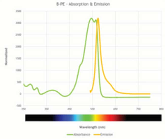 Because of its high quantum yield, B-PE is considered the world’s brightest fluorophore. It is compatible with commonly available lasers and gives exceptional results in flow cytometry, Luminex and immunofluorescent staining. B-PE is also less “sticky” than common synthetic fluorophores and therefore gives less background interference. Uses: Flow cytometry, Fluorescence-activated cell sorting, Custom Antibody labeling, Luminex, and T Cell labeling
