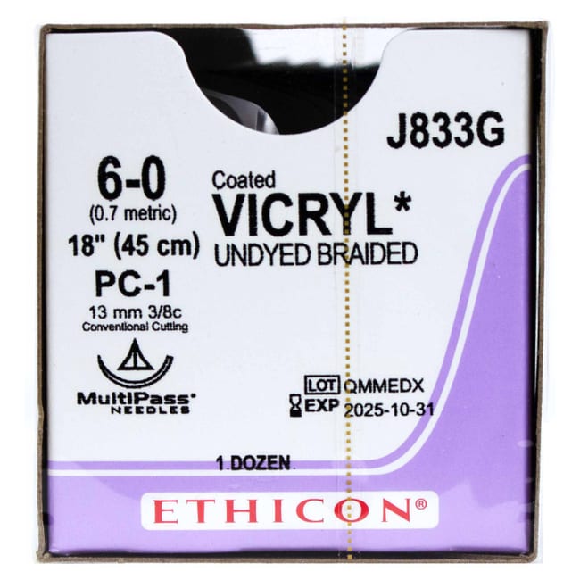The Ethicon J833G suture is a high-quality absorbable Vicryl Polyglactin 910 suture. It measures 18in in length, has a size of 6-0, and are undyed. This suture comes with a PC-1 13mm 3/8c Conventional Cutting Needle and has 12 sutures in a box.