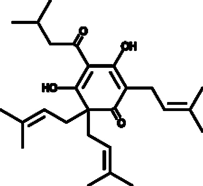 A beta-acid; active against B. subtilis and S. aureus (MICs = 1 and 1.2 UG/ml, respectively), and T. b. brucei and L. m. mexicana (IC50s = 0.9 and 4.7 UG/ml, respectively); scavenges DPPH radicals in a cell-free assay and inhibits lipid peroxidation in rat brain homogenates (IC50s = 25 and 39 µM, respectively); reduces proliferation, cell migration, and capillary tube formation in HUVECs at 2.5 to 50 UG/ml; lupulone (40 UG/ml) activates the extrinsic apoptotic death pathway in SW480 and SW620 colon cancer cells.