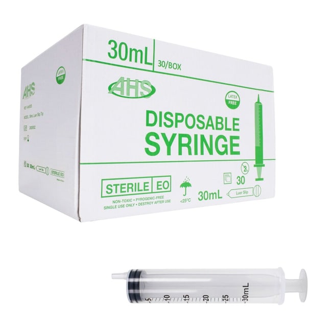 AHS AH30S 30mL Syringe comes with a clear barrel and easy to read graduation marks. The Luer Slip tip of this 30mL syringe fits conventional and safety needles. This quantity is 300/CS
