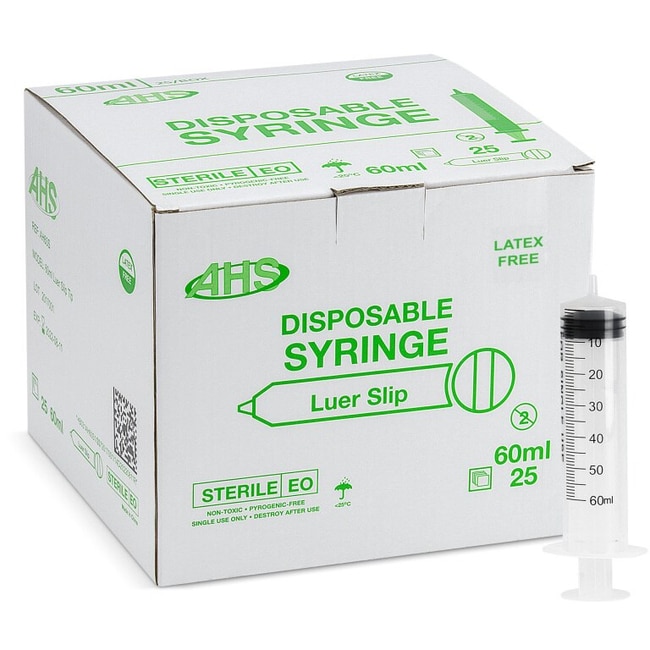AHS AH60S 60mL Syringe comes with a clear barrel and easy to read graduation marks. The Luer Slip tip of this 60mL syringe fits conventional and safety needles. This quantity is 250/CS
