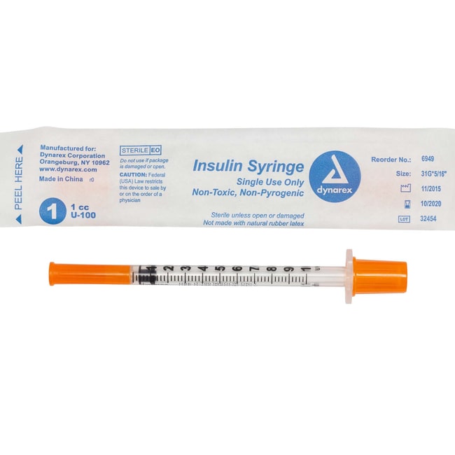 Dynarex Insulin Syringes are designed to deliver insulin effectively and precisely. These sterile, disposable Syringes are constructed with securely attached stainless-steel needles to help prevent needle pop-off for increased safety. The Insulin Syringes feature lubricated thin-walled, double-beveled needles for smoother insertion and improved patient comfort. Dynarex Insulin Syringes have transparent barrels with large-font gradations to allow for clear visualization. Dynarex Insulin Syringes are high-quality hypodermic syringes designed to effectively deliver insulin. Each disposable Syringe features a sterile, stainless-steel needle with a lubricated double-beveled tip for improved patient comfort. The transparent barrel is clearly marked with large-font numbering for accurate dosing and measurement.