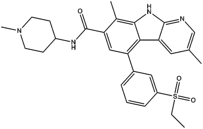 TAK-901 (CAS 934541-31-8) is a small-molecule inhibitor primarily targeting Aurora B kinase with reported IC50 values of 0 0017 M for Aurora-B/INCENP and 0 021 M for Aurora-A/TPX2 Derived from an azacarboline kinase hinge-binding chemotype TAK-901 demonstrates time-dependent selective inhibition of Aurora B suppressing histone H3 phosphorylation and inducing polyploidy in vitro It inhibits proliferation across a range of human cancer cell lines (40 500 nM) and additionally targets kinases such as FLT3 and FGFR2 in cells In preclinical rodent xenograft models TAK-901 reduces tumor growth and induces complete regression in ovarian cancer models A phase I clinical trial has evaluated its dosing and pharmacokinetic characteristics in patients with advanced solid tumors and lymphomas