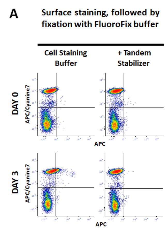 Tandem Stabilizer helps to reduce tandem dye de-coupling when added as a supplement to buffers commonly used to store stained, fixed cells, as well as those used for fixation and permeabilization procedures.