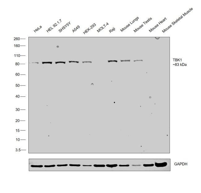 TBK1 serine/threonine kinase is a member of the IKK family and is involved in NF-kappa B activation and IRF3 signaling. TBK1 is a ubiquitous transcription factor and an essential mediator of gene expression during activation of immune and inflammatory responses. NF-KB mediates the expression of a great variety of genes in response to extracellular stimuli. NF-KB is associated with IKB proteins in the cell cytoplasm, which inhibit NF-KB activity. Phosphorylation of I-KB by IKB kinase (IKK) complex leads to degradation of I-KB and activation of NF-KB. The IKK complex contains IKKa, IKK beta, and IKKK. A novel IKK related kinase was recently identified and designated TBK1 (TANK-binding kinase 1), NAK (NF-KB-activating kinase), and T2K. NAK/TBK1 activates IKK beta through direct phosphorylation. NAK/TBK1 is activated by growth factors and PMA and mediates IKK and NF-kB activation in response to growth factors. NAK/TBK1 functions upstream of NIK and the IKK complex. NAK/TBK1 is also critical in protecting embryonic liver from apoptosis.