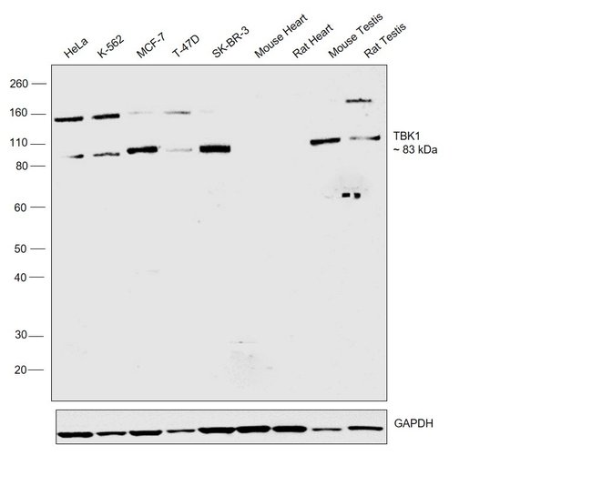 TBK1 serine/threonine kinase is a member of the IKK family and is involved in NF-kappa B activation and IRF3 signaling. TBK1 is a ubiquitous transcription factor and an essential mediator of gene expression during activation of immune and inflammatory responses. NF-KB mediates the expression of a great variety of genes in response to extracellular stimuli. NF-KB is associated with IKB proteins in the cell cytoplasm, which inhibit NF-KB activity. Phosphorylation of I-KB by IKB kinase (IKK) complex leads to degradation of I-KB and activation of NF-KB. The IKK complex contains IKKa, IKK beta, and IKKK. A novel IKK related kinase was recently identified and designated TBK1 (TANK-binding kinase 1), NAK (NF-KB-activating kinase), and T2K. NAK/TBK1 activates IKK beta through direct phosphorylation. NAK/TBK1 is activated by growth factors and PMA and mediates IKK and NF-kB activation in response to growth factors. NAK/TBK1 functions upstream of NIK and the IKK complex. NAK/TBK1 is also critical in protecting embryonic liver from apoptosis.