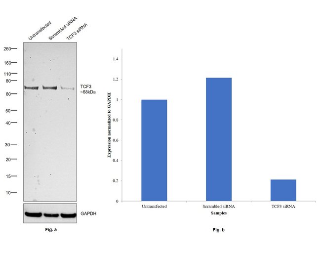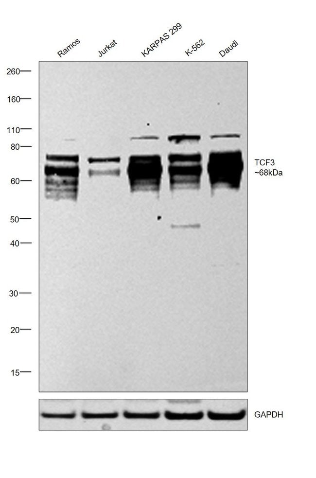 TCF3 (E2A) is a transcription factor that plays major roles in determining tissue-specific cell fate during embryogenesis, like muscle or early B-cell differentiation. Heterodimers between E2A and tissue-specific basic helix-loop-helix (bHLH) Dimers bind DNA on E-box motifs: 5'- CANNTG-3'. Binds to the kappa-E2 site in the kappa immunoglobulin gene enhancer. Deletions in E2A have been observed in a subset of pre-B-cell acute lymphoblastic leukemia (B-ALL) cases. Two alternatively spliced human isoforms have been described.