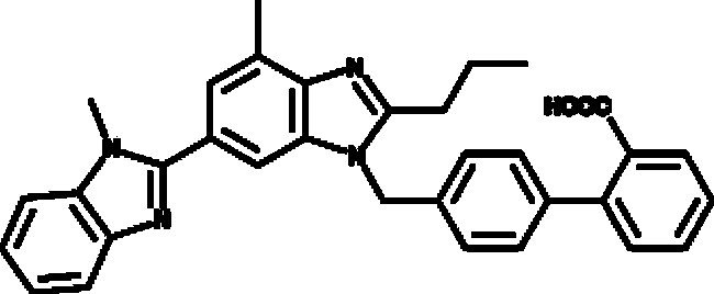 A nonpeptide angiotensin II receptor antagonist which selectively and insurmountably inhibits the angiotensin II AT1 receptor subtype (Ki = 3.7 nM); a partial agonist of PPARγ, activating the receptor to 25-30% of that produced by the full agonist rosiglitazone (EC50 = 4.5 μM); potently reduces blood pressure