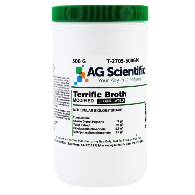 Terrific Broth is an enriched media for maintenance and propagation of E. Coli and plasmid growth. Produces higher cell densities resulting in greater yields of DNA or recombinant protein. Glycerol is used as a carbon source with this formulation instead of glucose as it will not ferment to acetic acid.pH (4.76% solution at 25ºC): 6.8-7.4