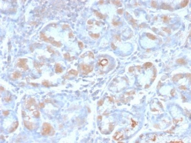 TFF1/pS2 Monoclonal specifically detects TFF1/pS2 in Human, Cynomolgus Monkey samples. It is validated for Immunohistochemistry-Paraffin.Specifications