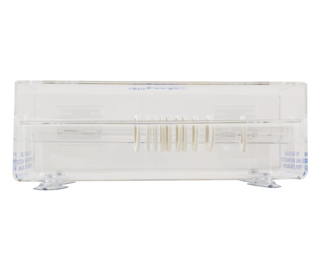 Acrylic dispenser for multiple 1 inch core time tapes. Includes flip top cover and bottom suction cups for secure placement.