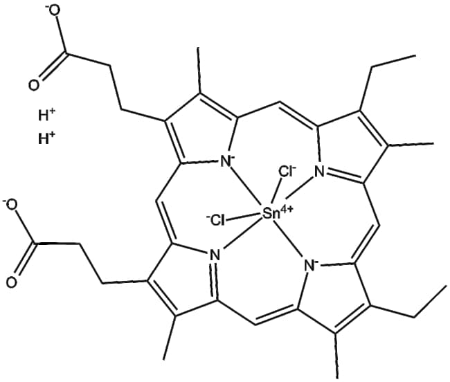 Tin Mesoporphyrin IX chloride is a small-molecule inhibitor targeting heme oxygenase (HO) It is designed to competitively inhibit HO an enzyme responsible for the oxidative degradation of heme to biliverdin carbon monoxide and ferrous iron thereby modulating heme metabolism and bilirubin formation Tin Mesoporphyrin IX chloride exerts its biological activity primarily through direct competition for the active sites of heme oxygenase In in vitro studies Tin Mesoporphyrin IX chloride demonstrates inhibition with reported inhibition constants (Ki) in the nanomolar range Based on these pharmacological properties Tin Mesoporphyrin IX chloride holds research potential in studies of heme metabolism bilirubin regulation hyperbilirubinemia modulation and exploration of heme oxygenase function in metabolic disorders