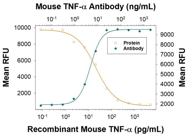 In sandwich ELISAs, approximately 50% cross-reactivity with recombinant rat TNF- alpha is observed and less than 1% cross-reactivity with recombinant human TNF-alpha is observed. Reconstitute at 0.2 mg/mL in sterile PBS. Endoxin level is <0.10 EU per 1 μg of the antibody by the LAL method.