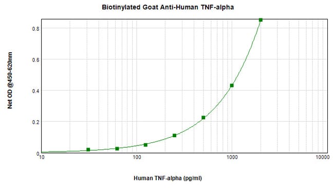 AA Sequence of recombinant protein: VRSSSRTPSD KPVAHVVANP QAEGQLQWLN RRANALLANG VELRDNQLVV PSEGLYLIYS QVLFKGQGCP STHVLLTHTI SRIAVSYQTK VNLLSAIKSP CQRETPEGAE AKPWYEPIYL GGVFQLEKGD RLSAEINRPD YLDFAESGQV YFGIIAL. Preparation: Produced from sera of goats immunized with highly pure Recombinant Human TNF-alpha. Anti-Human TNF-alpha-specific antibody was purified by affinity chromatography and then biotinylated. Sandwich ELISA: To detect Human TNF-alpha by sandwich ELISA (using 100 μL/well antibody solution) a concentration of 0.25-1.0 μg/mL of this antibody is required. This biotinylated polyclonal antibody, in conjunction with PeproTech Polyclonal Anti-Human TNF-alpha (500-P31AG) as a capture antibody, allows the detection of at least 0.2-0.4 ng/well of Recombinant Human TNF-alpha. Western Blot: To detect Human TNF-alpha by Western Blot analysis this antibody can be used at a concentration of 0.1-0.2 μg/mL. When used in conjunction with compatible secondary reagents, the detection limit for Recombinant Human TNF-alpha is 1.5-3.0 ng/lane, under either reducing or non-reducing conditions. 500-P31AGBT-1MG will be provided as 2 x 500 μg