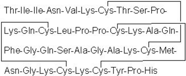 Margatoxin is a potent KV1.3 channel blocker (IC50 = 36 pM). Displays no effect at calcium-activated channels. Reduces VEGF-induced transmembrane calcium influxes and nitric oxide production in human endothelial cells.