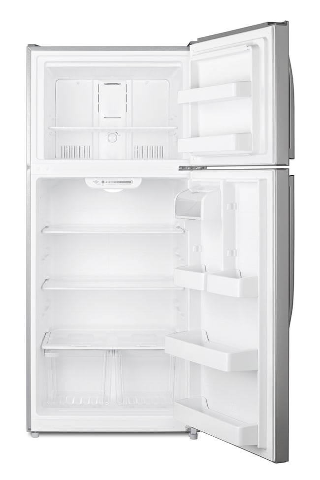SUMMIT's selection of top freezer refrigerators offers true convenience for every kitchen, including break rooms and other general purpose facilities.The CTR18PL is a full-sized refrigerator-freezer. The large interior offers 18 cu.ft. of storage capacity, with frost-free operation for low maintenance use. It comes in a textured gray cabinet with user-reversible fingerprint-free doors that offer the look of stainless steel without the constant cleanup.Inside, the CTR18PL includes adjustable glass shelves in the refrigerator compartment and two clear crispers. The door features full-sized storage racks, including one that holds full gallon containers. Two half-sized door racks are adjustable to accommodate different sized items, with an additional fixed butter dish. The upper freezer compartment comes with a full-width wire shelf and two door bins. This unit includes an automatic interior LED light and easy-to-use interior thermostat.