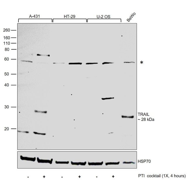 Recommended positive controls: human TNFSF10-transfected 293T cells. Predicted reactivity: Cat (81%), Pig (80%), Rhesus Monkey (97%), Chimpanzee (98%). Store product as a concentrated solution. Centrifuge briefly prior to opening the vial.