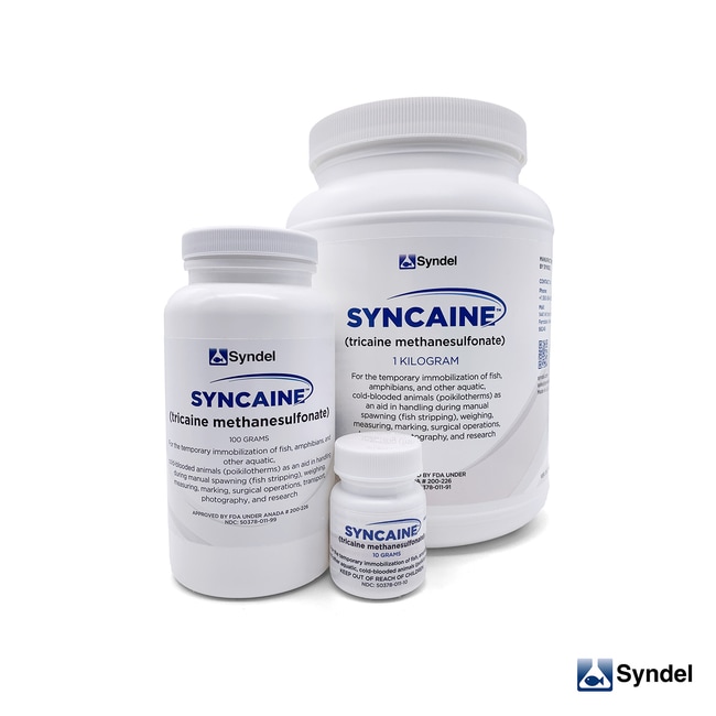 Syndels Syncaine (also known as MS-222, TMS, tricaine methanesulfonate) is a fish anesthetic used for the temporary immobilization of fish, amphibians, and other aquatic cold-blooded animals (poikilotherms) around the world. Syncaine has long been recognized as a valuable tool for the proper handling of these animals during manual spawning (fish stripping), weighing, measuring, marking, surgical operations, transport, photography, and research. Syncaine is a fully approved drug in the USA, Canada and the United Kingdom.