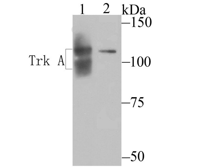 NTRK1 (TRKA) belongs to the neurotrophic factor family of related polypeptides central to the development and maintenance of the mammalian nervous system. TrkA is a membrane-bound receptor that, upon neurotrophin binding, phosphorylates itself and members of the MAPK pathway. The presence of TrkA leads to cell differentiation and may play a role in specifying sensory neuron subtypes. Mutations in TrkA have been associated with congenital insensitivity to pain, anhidrosis, self-mutilating behavior, mental retardation and cancer.