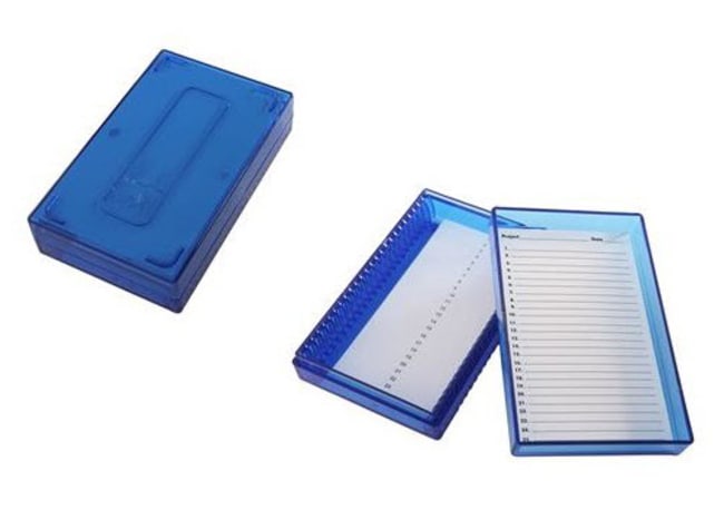 Protect your slides in ultra-low temperature ranges down to -80 deg C with these stackable slide boxes. Safely store and transport 25 x 75 mm (3 x 1 inch) slides. The uniform grooved slide slots separate slides, preventing slide contact. They feature a temperature-resistant numbered foam lining and an identification sheet. Durable blue polycarbonate with a friction-fit lid.