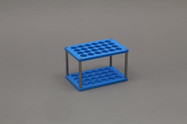 TUBE RACK, 2 3D-printed PLA Plates, Holds 15 x 92mm Plastic, Flat Bottom Sample Tubes with Labels, 4 x 6 for 24 Total, 6.4mm Thick Top and Bottom Plate, Connected with Stainless Steel Stand-offs, for 80mm Overall Height, SLAS Footprint