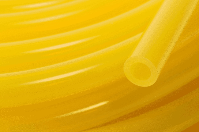 Flexible tubing formulated for fuel and lubricant transfer that resists swelling, hardening, and embrittlement caused by hydrocarbon-based fluids. Translucent yellow construction allows visual flow monitoring. Supplied in 50 ft coils for small-engine and industrial fluid transfer applications.