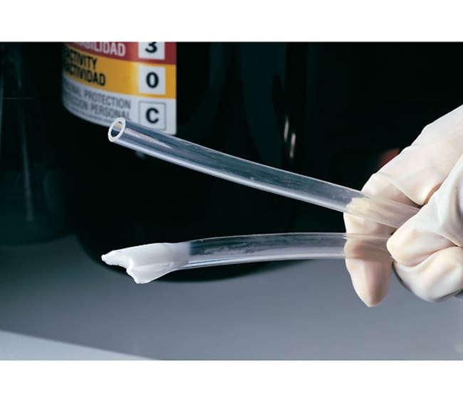 These transparent tubes are ideal for use with highly aggressive chemicals ¿ acids, bases, ketones, salts, and alcohols. Characteristics include plasticizer free, smoother inner surface, hydrophobic, minimal outgassing, safe disposal via incineration, and nontoxic. NSF 51 Standard compliant and manufactured according to GMP. Temperature range is -108 to 130¿F (-78 to 54¿C). Can be sterilized with ethylene oxide or gamma irradiation.