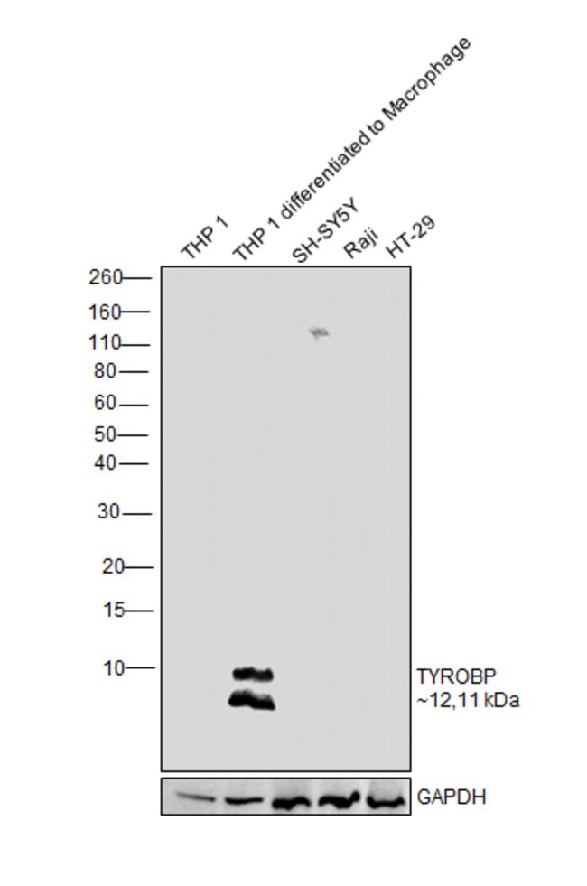 DAP12 is a transmembrane adaptor protein that is non-covalently associated with several cell surface receptors on natural killer (NK), myeloid, and presumably neuronal cells. DAP12 contains an ITAM domain that preferentially recruits the protein tyrosine kinase Syk to initiate signal transduction. Deficiency of DAP12 results in reduced antigen presentation function by myeloid cells and defects in function of certain NK cell receptors in mice, as well as presenile dementia and bone cysts in humans.